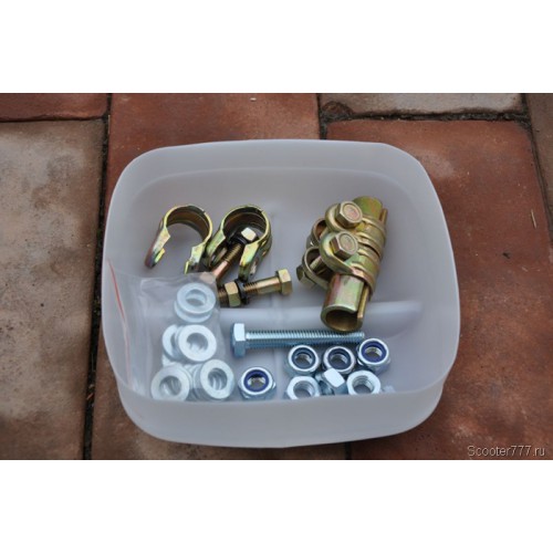 В комлекте: демпфер от Мерса, 2 муфты рулевых тяг от ВАЗ, 2 болта М10х60, шайбы и гайки М10 (гайки обычные и самоконтрящиеся, с нейлоновой вставкой).